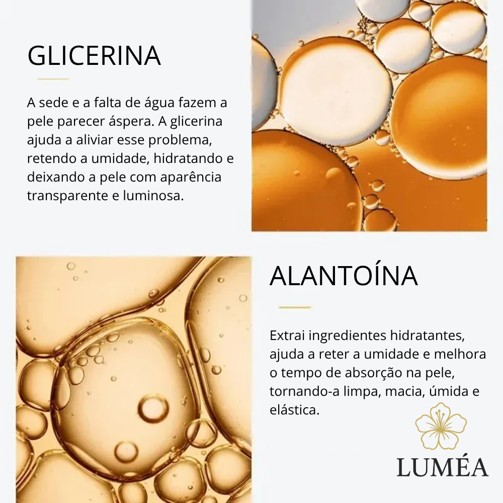 Essência de Ouro 24K: Proporciona um toque de luxo, deixando a pele suave e radiante.