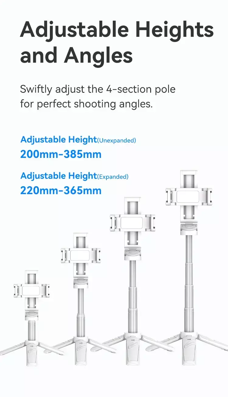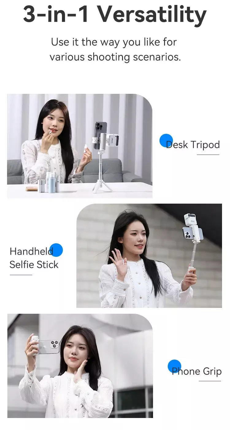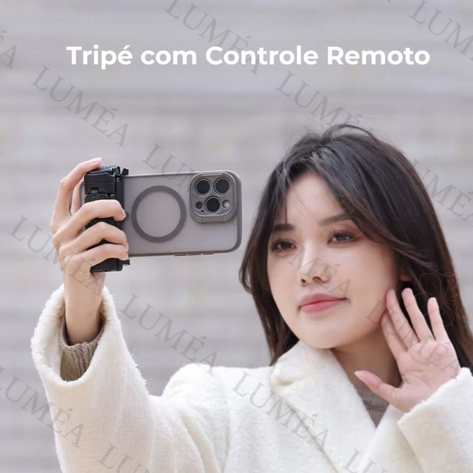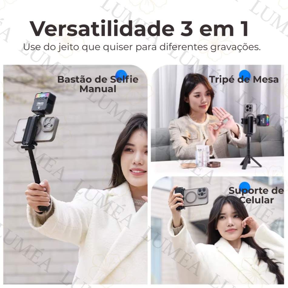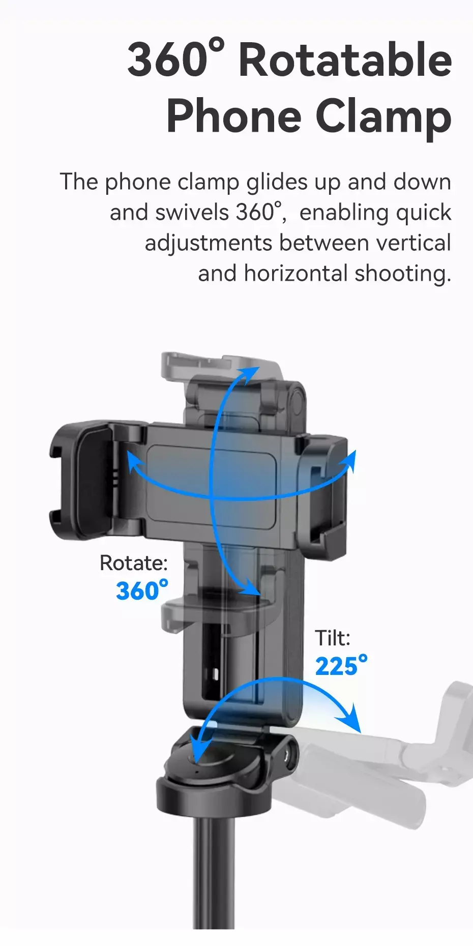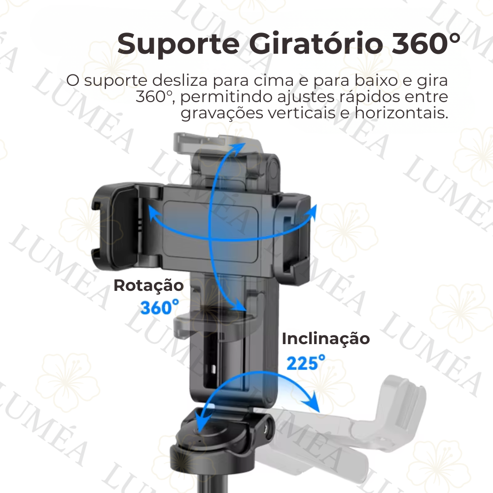 O suporte do celular gira 360° e inclina até 225°, possibilitando ajustes rápidos entre gravações verticais e horizontais, sempre no ângulo perfeito.