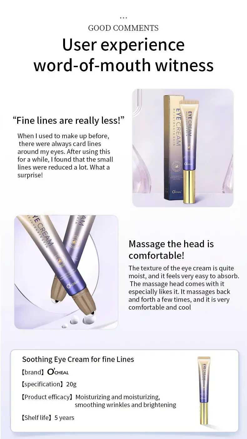 Dê um novo brilho ao seu olhar com o O’CHEAL Creme para os Olhos Antirrugas com Bola de Rolo, o segredo para uma pele mais firme, hidratada e rejuvenescida.